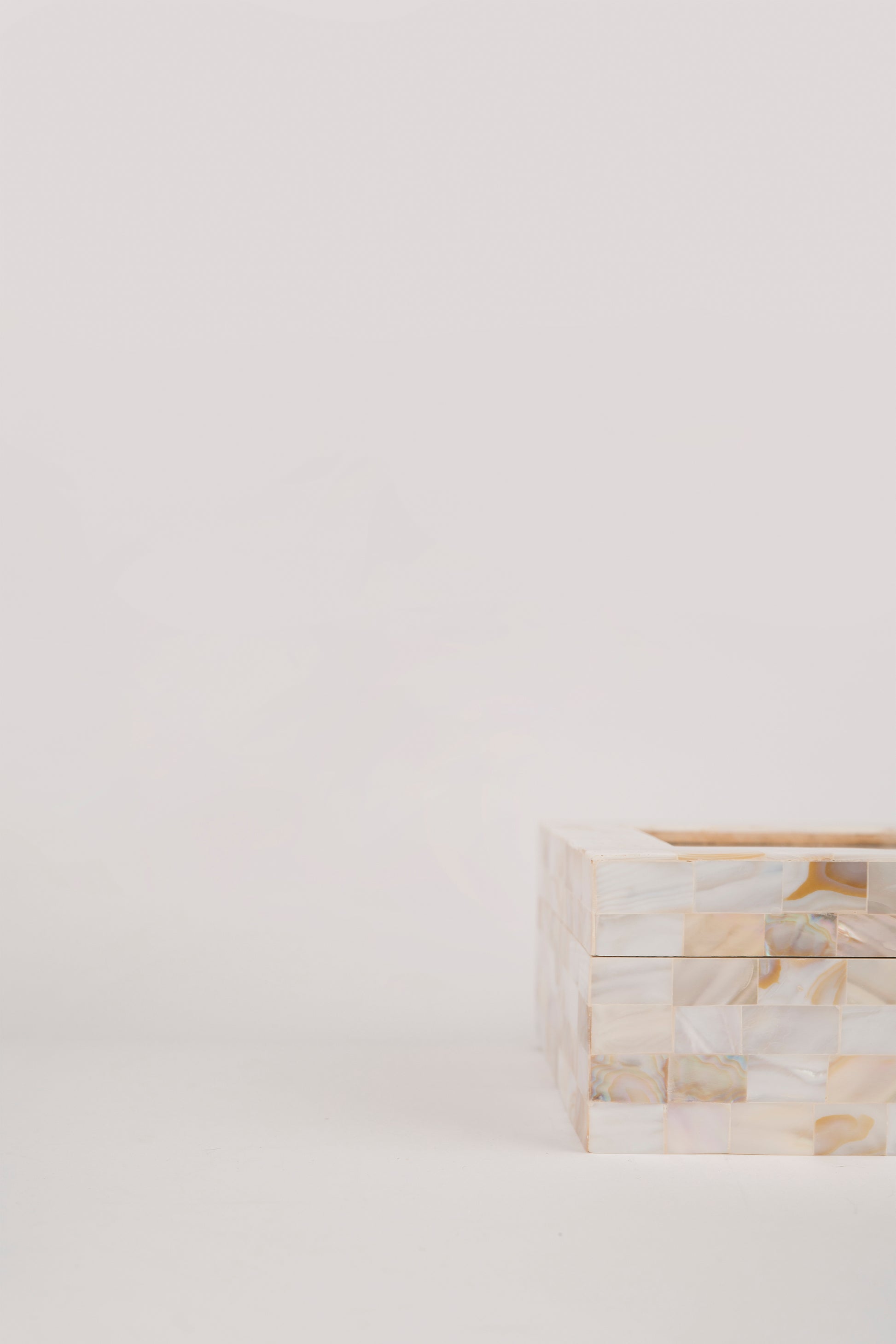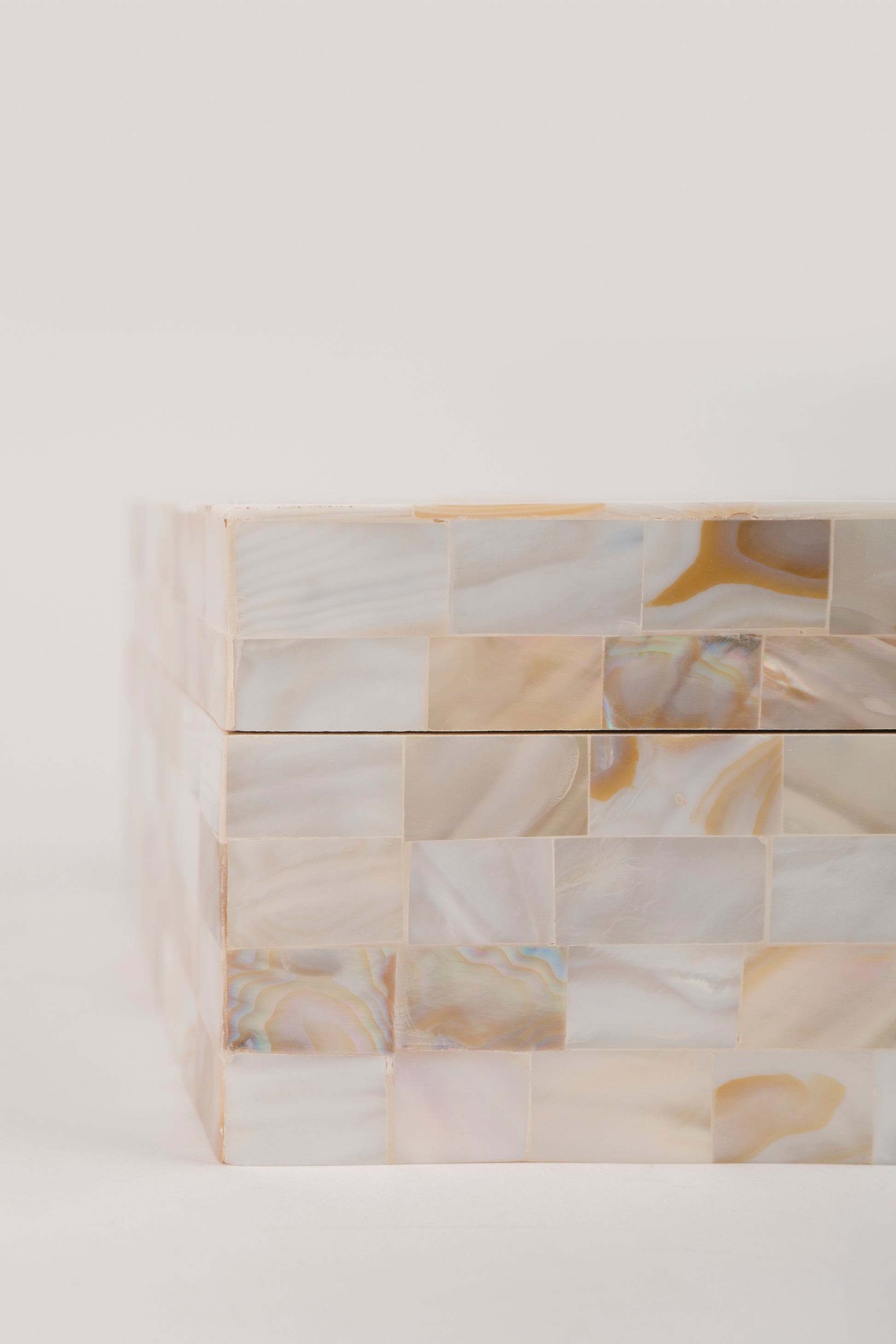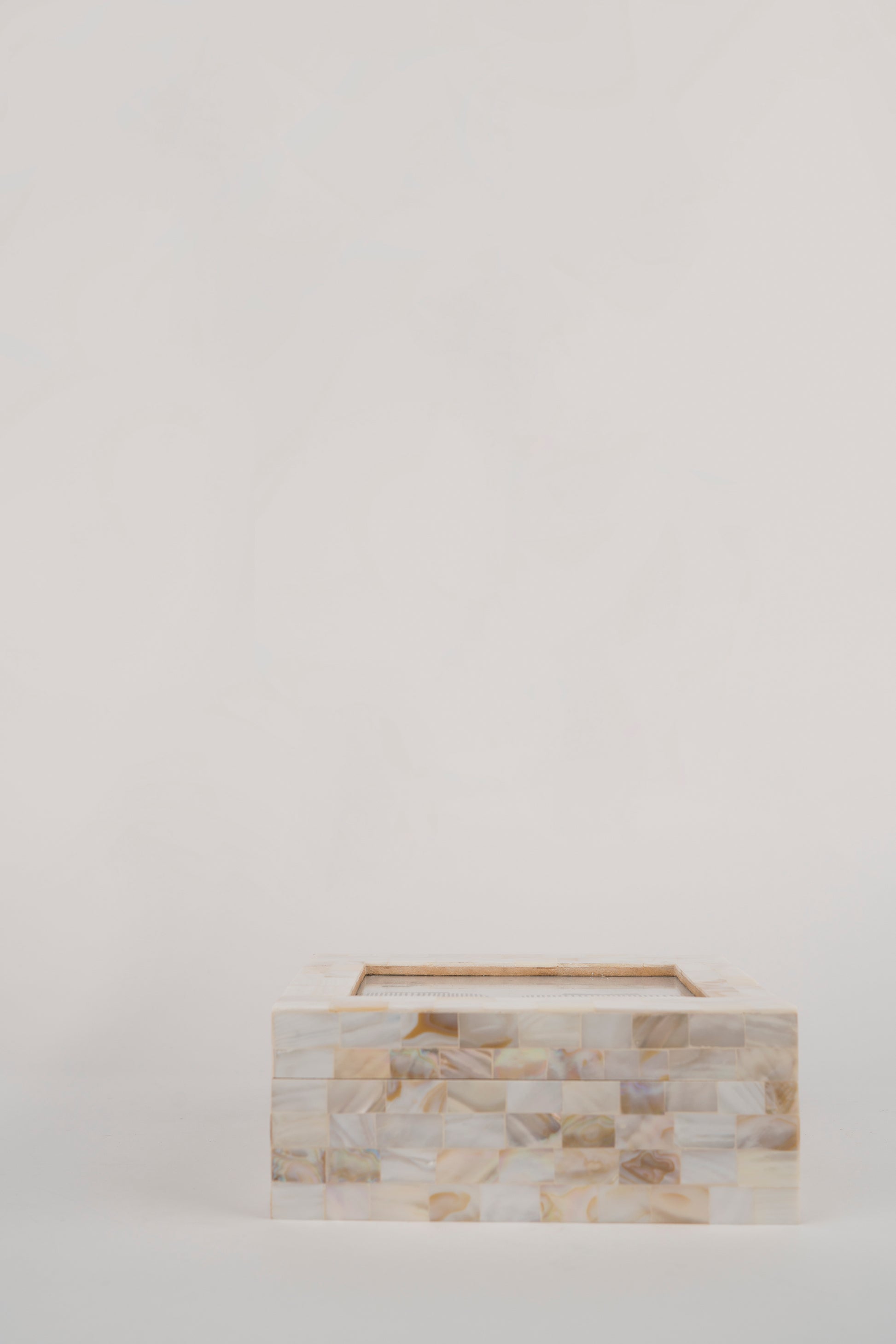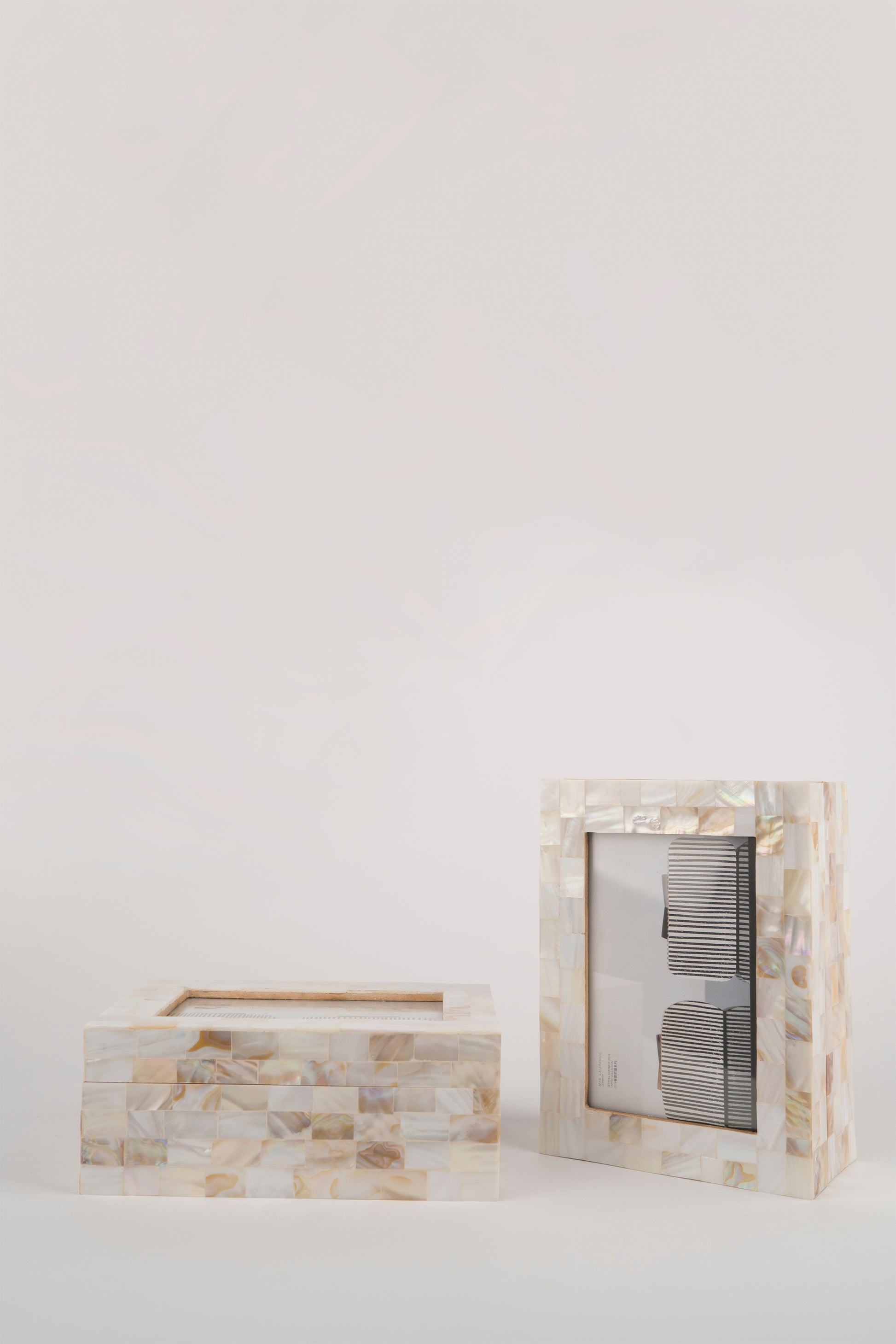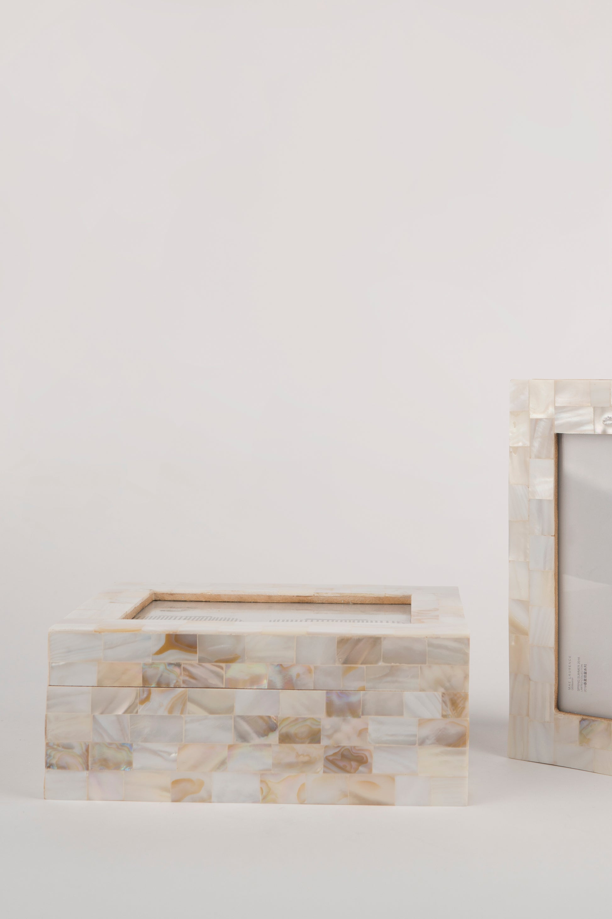 Diese edle Holzvitrine vereint handwerkliches Können mit natürlicher Eleganz. Sie wird in den Philippinen von Hand gefertigt und verfügt über ein kunstvolles Muschelmosaik-Inlay, das einen leuchtenden Hintergrund für Ihre wertvollsten Fotos bildet. Die polierte Vitrine aus Naturmuscheln misst 19,25 x 14 x 7,5 cm und bietet Platz für verschiedene Fotoformate, darunter 15 x 10 cm, 10 x 15 cm und 4 x 6 Zoll. Jedes Stück zelebriert die organische Schönheit von Küstenmaterialien und bietet eine anspruchsvolle Möglichkeit, Erinnerungen zu bewahren und zu präsentieren. Ein zeitloser Akzent für anspruchsvolle Interieurs.